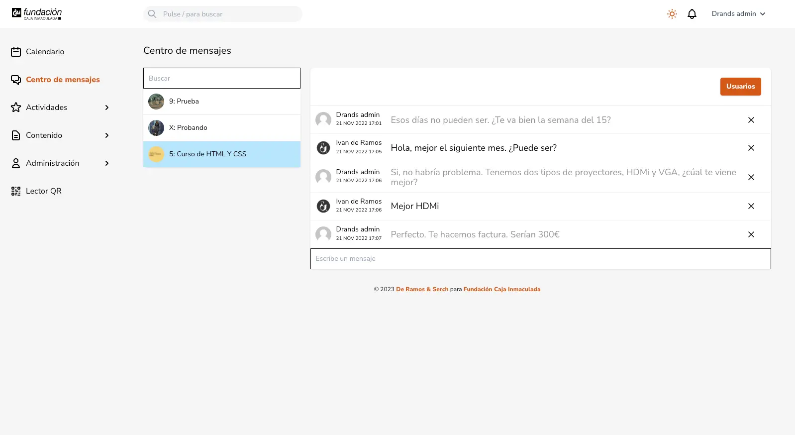 Una vez clickamos en la conversación elegida podemos ver los mensajes a modo de chat. Cada mensaje generará un mail para asegurarnos de que el usuario lo recibe.